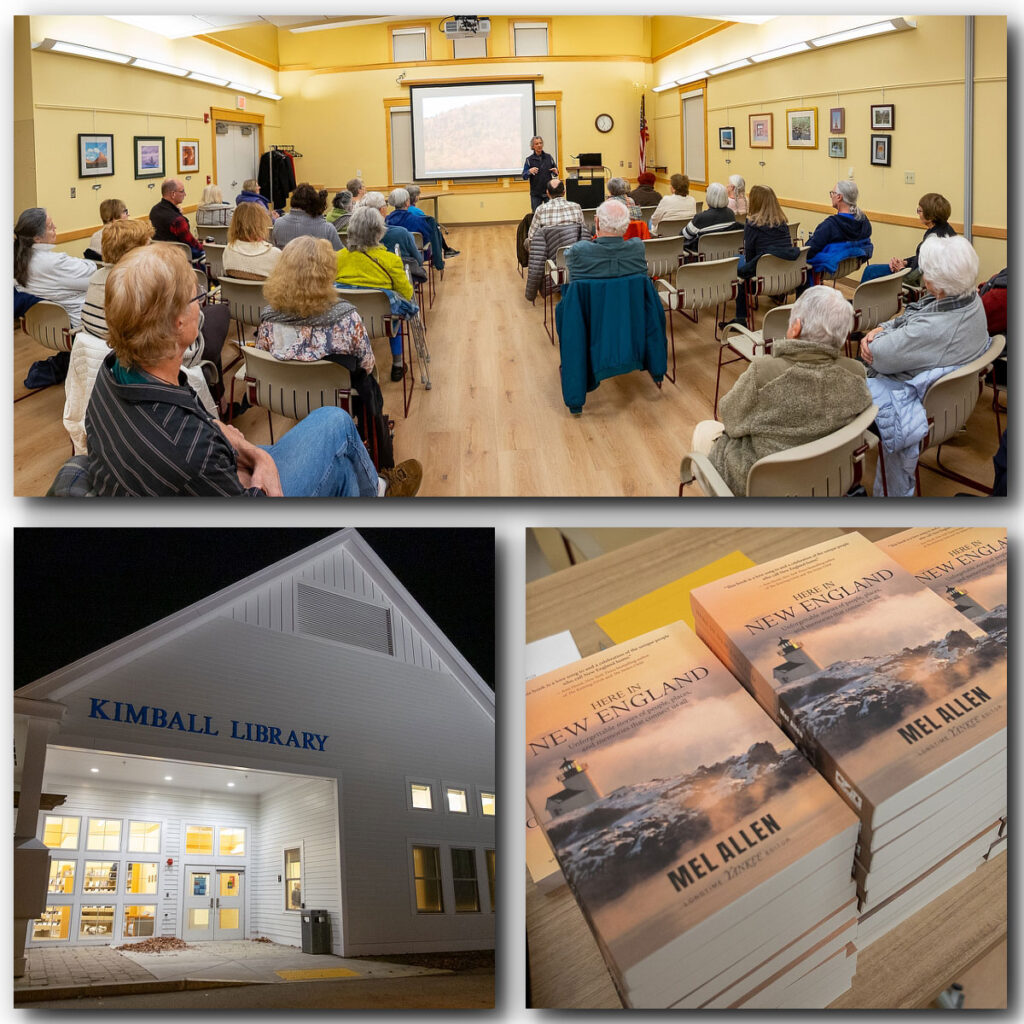 Late last November I had the opportunity to meet and photograph writer Mel Allen at the Kimball Library here in Atkinson NH. You may remember him as the editor for Yankee Magazine. Mel recently retired after 45 years with the magazine. I had the opportunity to photograph a few articles for Yankee in the early 2000’s but never got to meet with Mel. When I saw the notice at the library he was presenting that week I made sure to attend. His presentation of his new book “Here in New England” is a collection of some of his many articles over the years. I have enjoyed reading these stories of amazing characters throughout New England and how they were presented then. At the end of each story he updates us on what they are doing now years later. I highly recommend you pick this one up and if you get a chance make sure to attend one of his events and readings. A virtual presentation is scheduled January 22 and you can sign up at this link.
